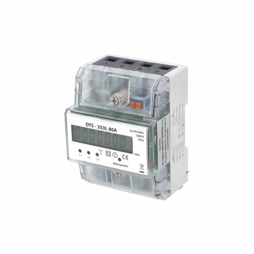 Třífázový elektroměr s LCD displejem pro střídavé napětí 3x230 V / 400 V, 50Hz, slouží k měření činné elektrické energie v přímém zapojení do obvodu. Je určen na podružné měření spotřeby samostatných spotřebičů nebo spotřebičů ve skupinách. Jedná se o přesný elektroměr, který měří již od minimálních hodnot protékajícího proudu (0,25 A) až po 80 A, velký podsvícený LCD displej zobrazuje hodnoty na číselníku od 000000,01 až 999999,99 [kWh] a to bez přivedeného napájení po dobu až 10 let (záleží na okolním prostředí), zobrazené naměřené hodnoty nelze vymazat. Indikační LED blikají při odběru konkrétní fáze. Elektroměr má impulzní výstup na svorkách (20) S0+ a (21) S0-. To umožňuje připojení externího zařízení, které počítá impulzy (S0 dle normy DIN 43864) generované elektroměrem. Ke správné funkci elektroměru se nevyžaduje zapojení tohoto doplňkového zařízení. Montuje se na nosnou lištu 35 mm (DIN lištu), vestavná šířka je 76 mm (4,5 mod.). Šroubové svorky pro pohodlné připojení vodičů až do průřezu 35 mm2, svorky pro nulový vodič „N“ jsou vzájemně (galvanicky) propojené a není nutné rozdělovat „N“ vodič. Utahovací moment šroubů : svorka č. 1-8 = 2,0 - 3,0 Nm, svorka č. 20-21 = 1,0 - 1,2 Nm. Vlastní spotřeba je menší než 2 W.